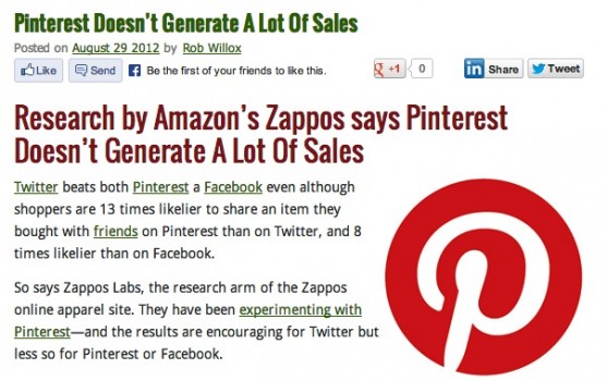 A la même époque que l’article précédent de TechCrunch, en 2012, on pouvait lire un autre article qui venait clairement nuancer le propos en parlant non plus de trafic généré mais de conversion et d’achats. Et cette fois, la source n’était autre que le directeur de Zappos Labs, donc quelqu’un a qui je suis déjà par nature plus enclin à faire confiance qu’à un amalgame de 200,000 sites indéterminés de Shareaholic.